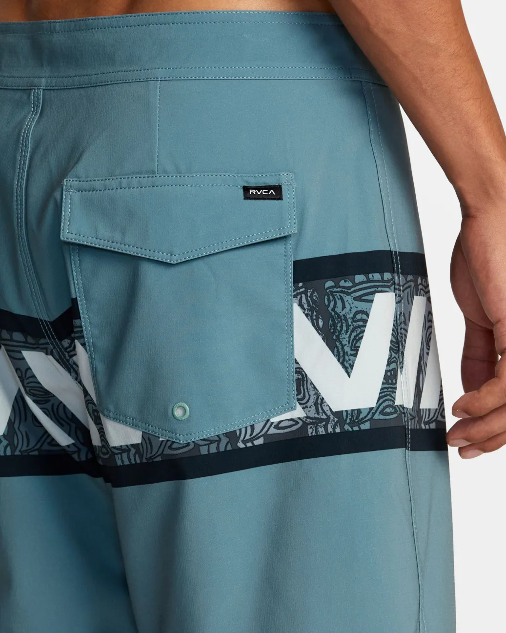 The Tiki boardshorts from the Hawaii x Mark Oblow collection channel island ease with their banded graphic design, 4-way stretch fabric blend and mini Motors patch. Featured here in the Grey colorway.