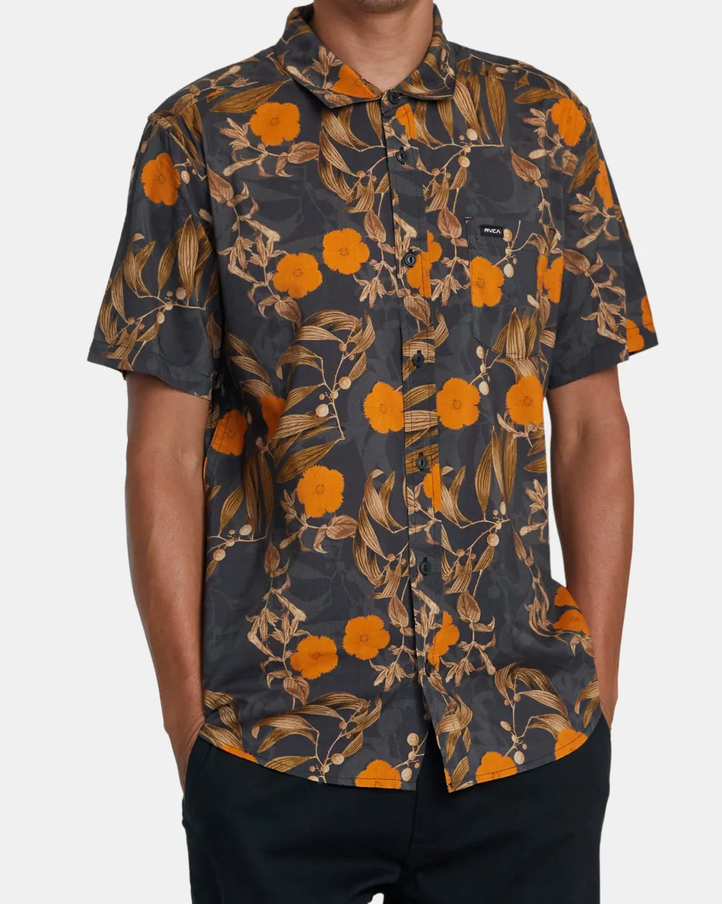 Experience easy summer style with RVCA’s Botanical printed short-sleeve woven shirt. Made from a premium blend of cotton and viscose to keep it feeling soft and light, this regular-fit shirt features a classic collar, a single chest pocket, and a scalloped hem. Featured here in the Black colorway.