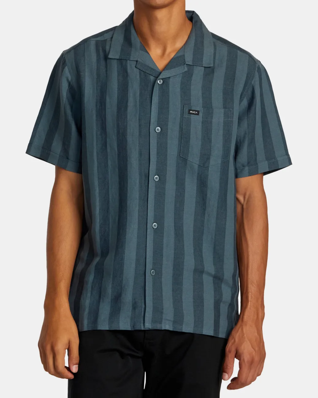 Elevate your wardrobe with the RVCA Love Stripe Short Sleeve Woven Shirt. Crafted from a lightweight linen-viscose blend fabric in a slightly relaxed fit for easy wear, this printed button-up shirt features a traditional collar neck, a single chest pocket, and a scalloped hem for an elevated look. Featured here in the Petrol Blue colorway.