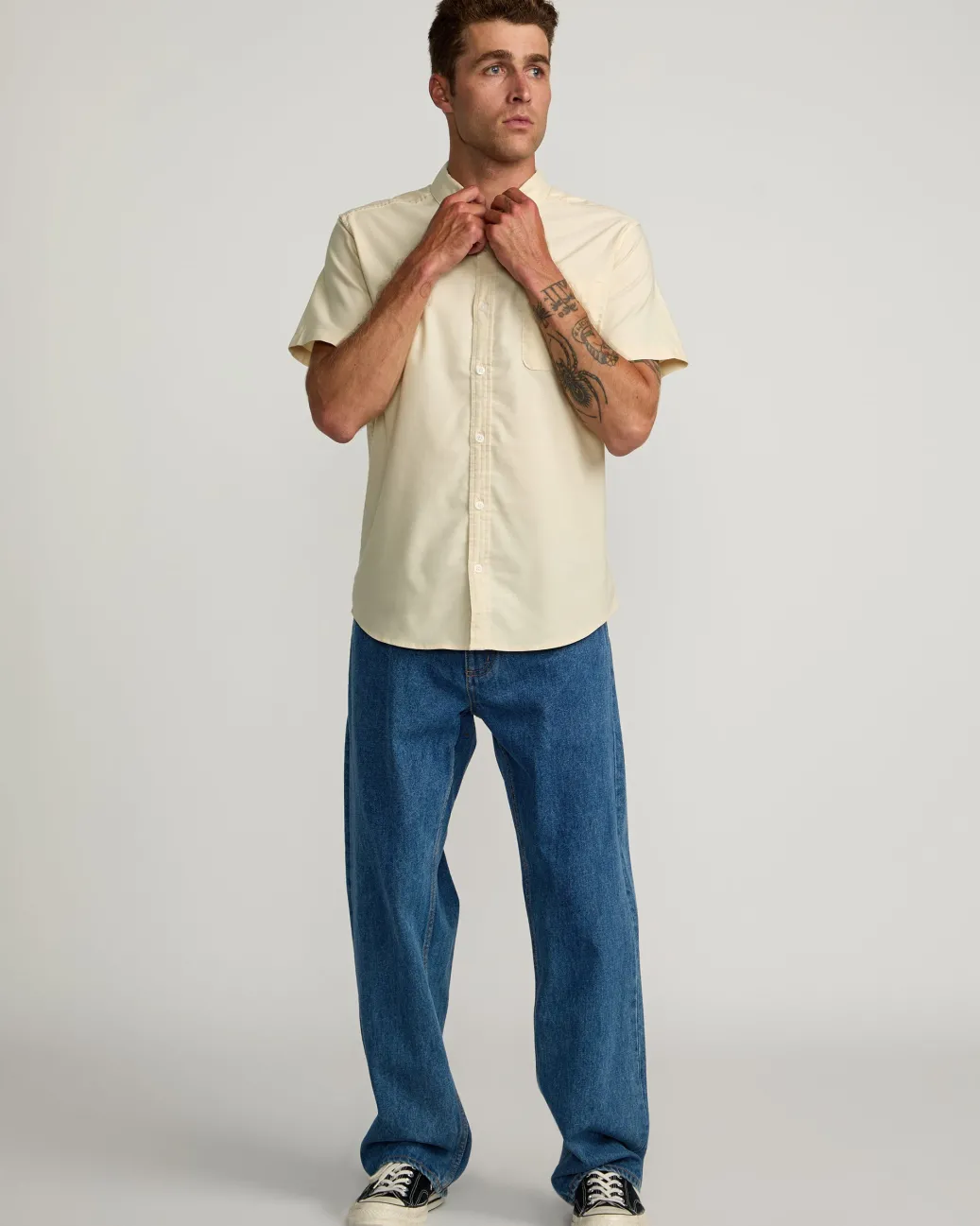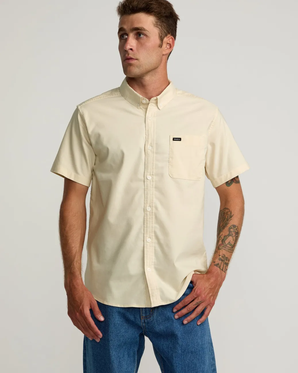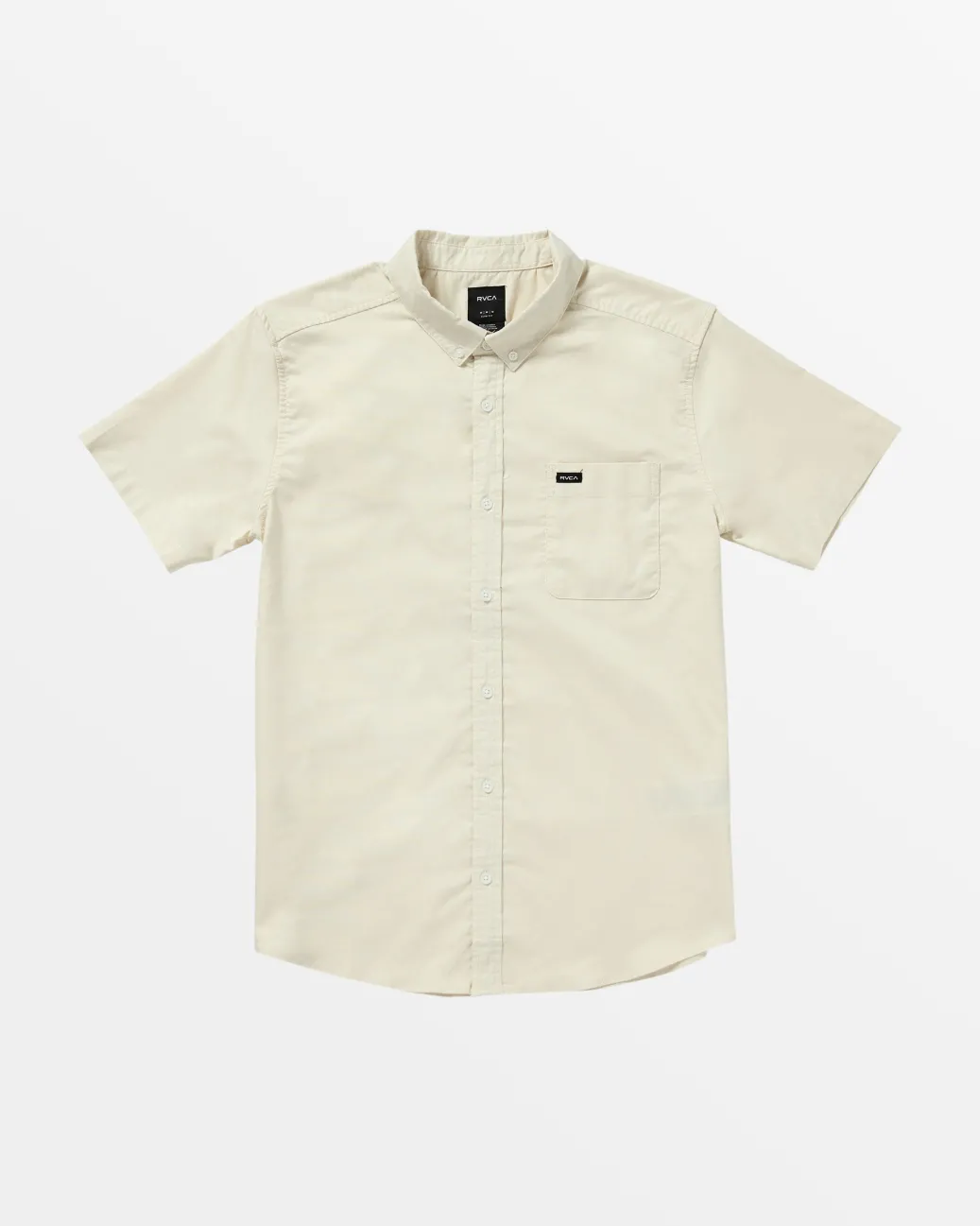 The RVCA That’ll Do shirt puts style and comfort in the game with a slim fit, stretch cotton blend, button down collar, and scalloped hem. Featured here in the Latte colorway.