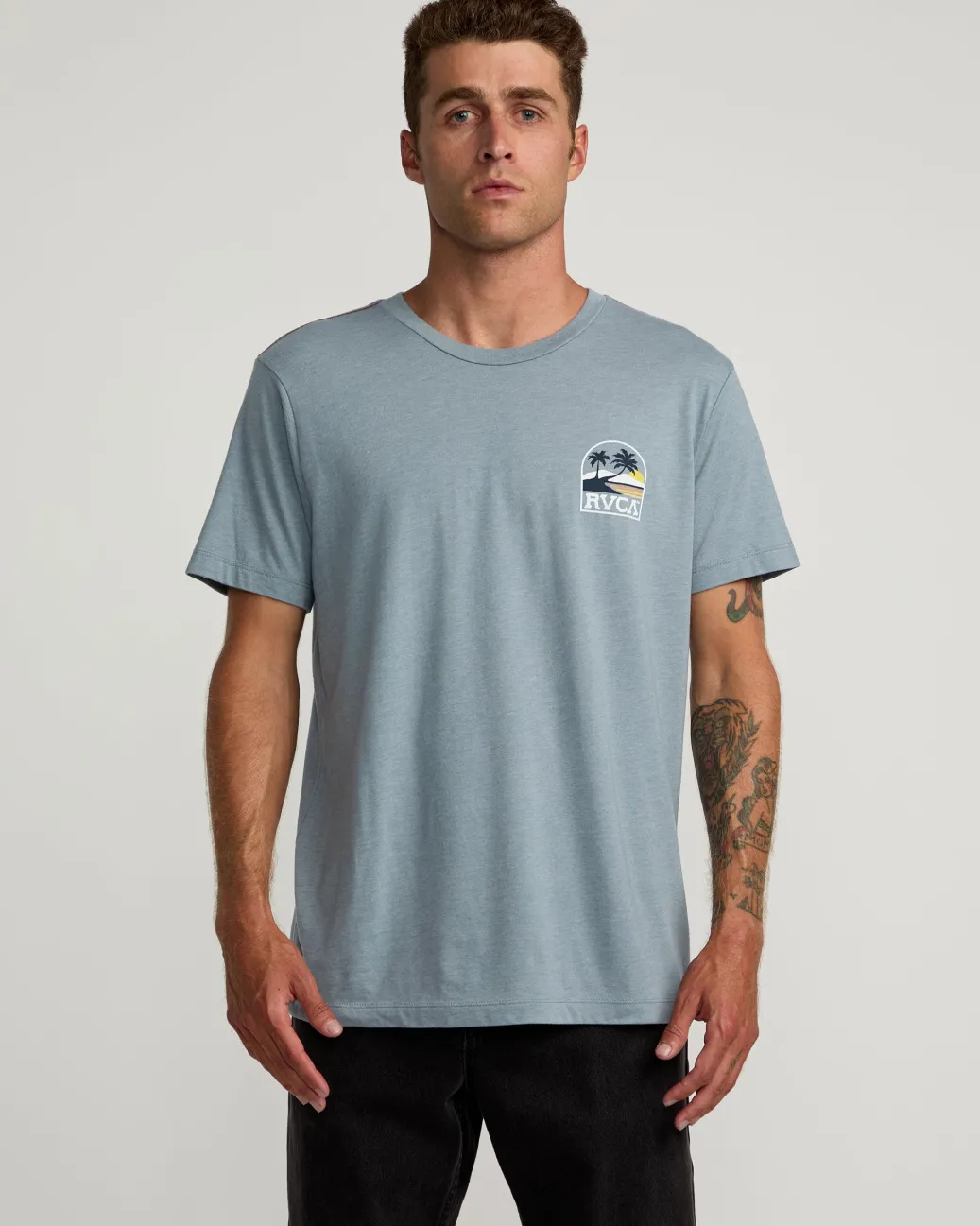 A vintage-dyed tee built for sunny days ahead. The slim fit and crewneck design keeps it classic while the screen printed graphics infuse laidback style. Featured here in the Flint Stone colorway.