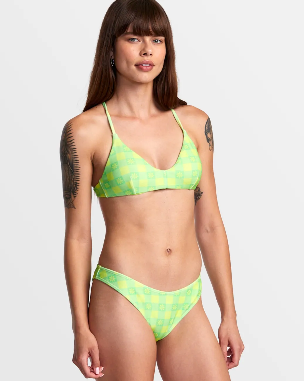 Coming in a neon check print, RVCA’s Picnic Crossback Triangle Bikini Top knows how to make a statement. This sporty women’s swim top is crafted of partially recycled terry texture fabric with removable cups and criss-cross tie straps to customize the fit. Featured here in the Neon Green colorway.