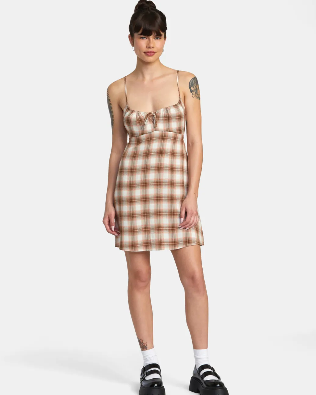 Made of woven cotton, the Hillside mini dress enhances a classic empire-waist silhouette with gathers and a tie at the neckline. Coming in a range of signature RVCA prints, it’s an effortless look for your next night out. Featured here in the Workwear Brown colorway.