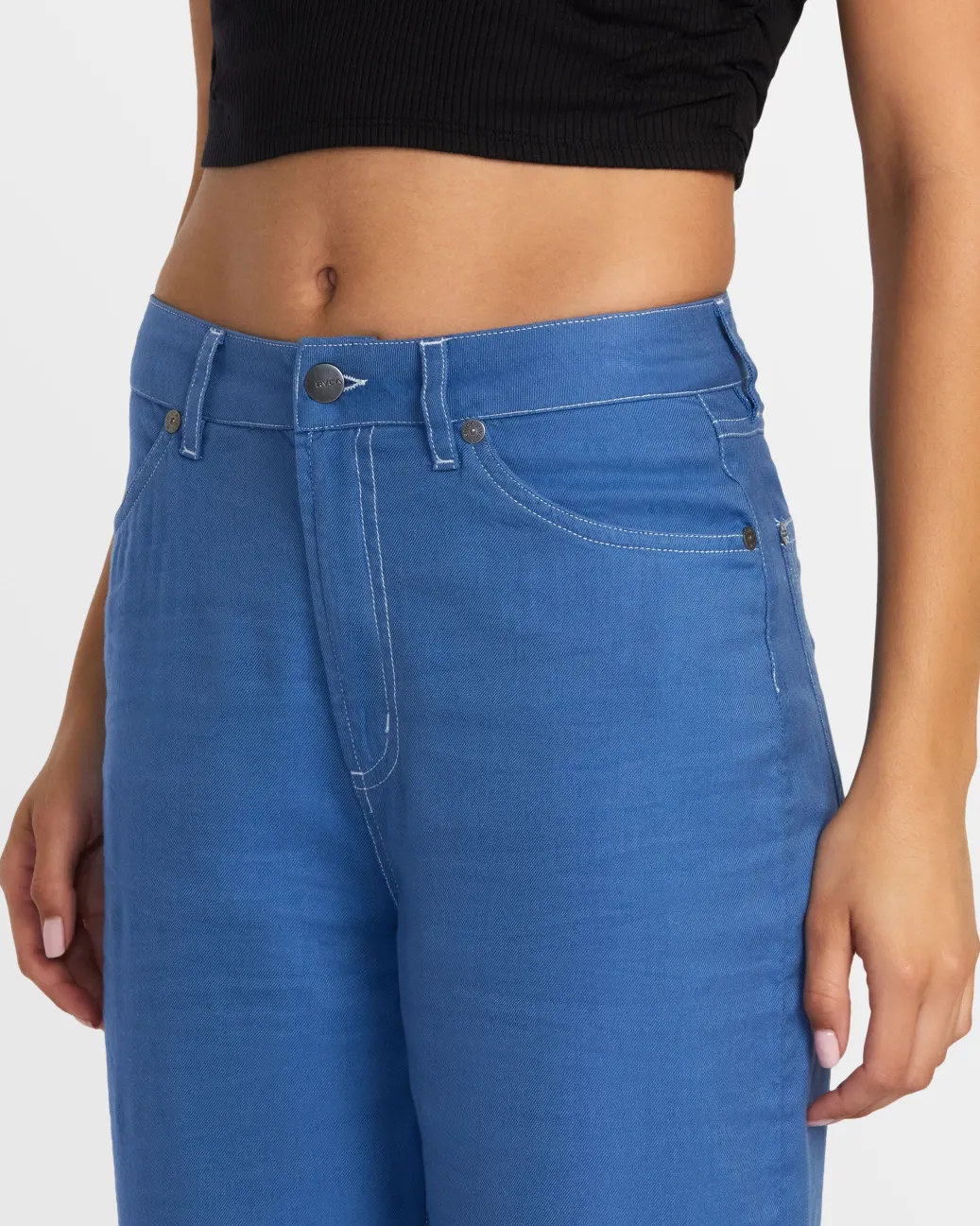 Elevate your wardrobe with RVCA Women’s Coco Pants. Fitted through the waist and hips and flared wide at the legs, these high-rise pants are crafted from a blended-cotton woven fabric, with VA stitching on the back pockets and raw-edge detail at the bottom hem for a perfectly distressed look. Featured here in the Federal Blue colorway.
