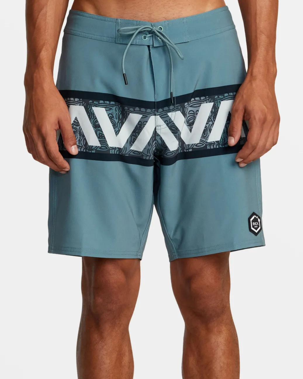 The Tiki boardshorts from the Hawaii x Mark Oblow collection channel island ease with their banded graphic design, 4-way stretch fabric blend and mini Motors patch. Featured here in the Grey colorway.