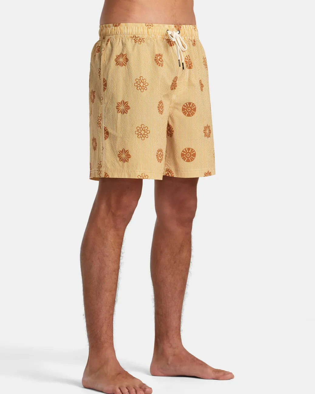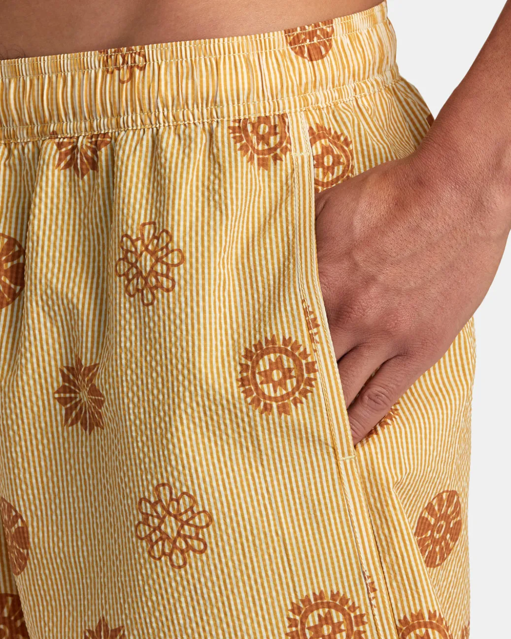 RVCA’s Endless 17″ Elastic Waist Shorts feature heritage stretch recycled fabric, a regular fit, an elastic waist and drawcord closure for an adjustable fit. Side seam pockets and a back patch pocket provide ample storage, while the short length brings a modern look. Branding includes RVCA solo label on the back pocket and Mini Motors patch at the left leg. Featured here in the Gold colorway.