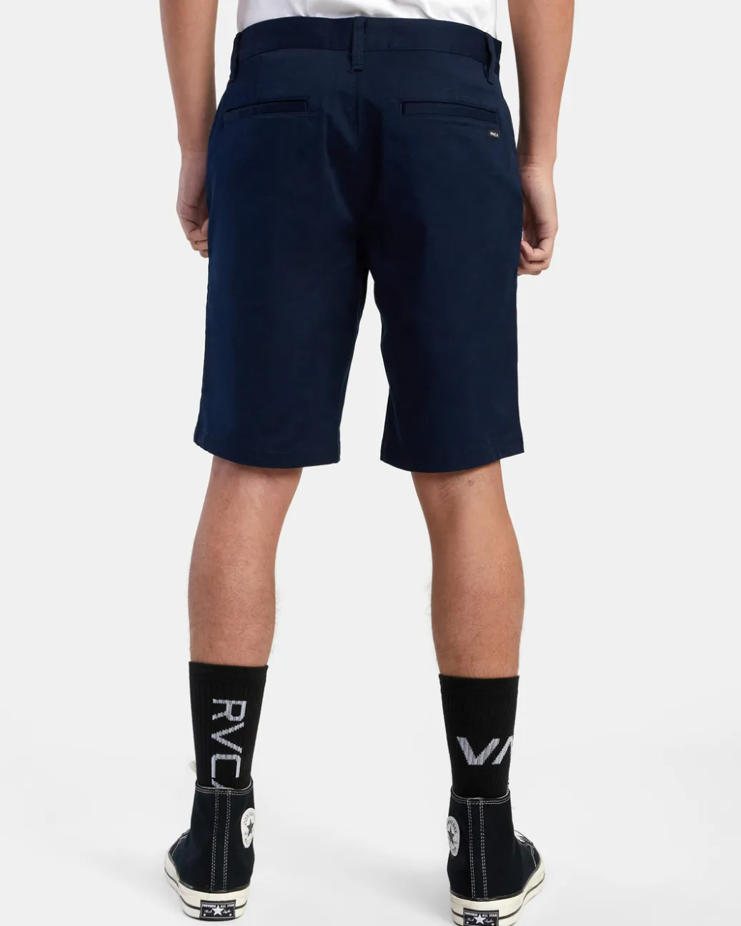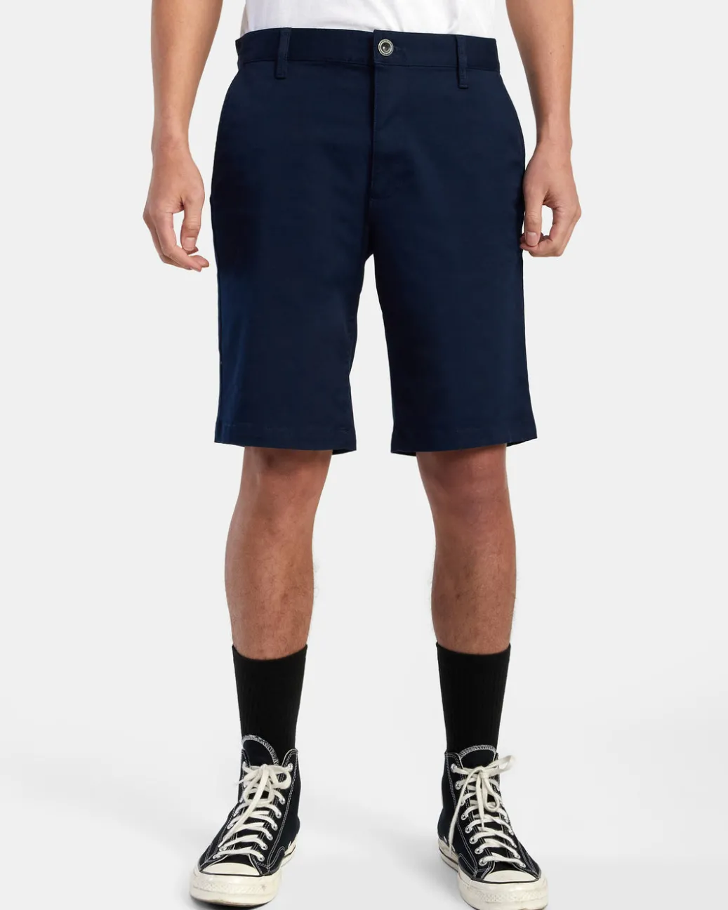 The RVCA Weekend Stretch Chino Shorts deliver clean lines matched with comfortable stretch. Bringing together durable blended cotton fabrication and timeless design, the men’s shorts feature a slim, straight fit, topped with slash pocketing at the front and welt pockets at the back. Featured here in the Navy Marine colorway.