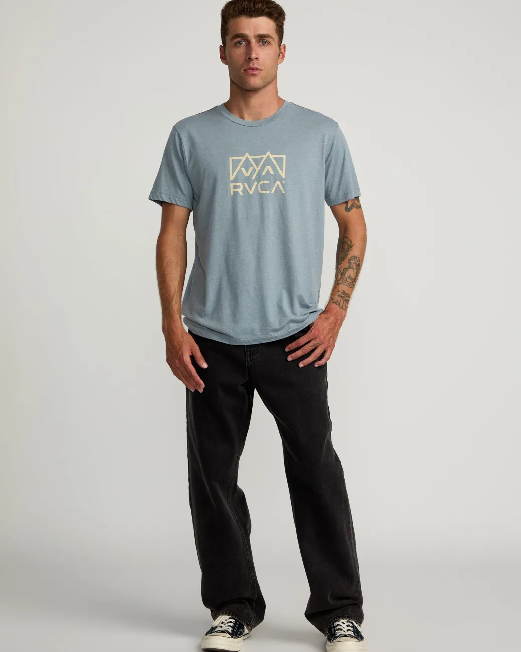 This vintage-washed cotton-poly tee boasts a slim fit and crew neck for an essential look that never goes out of style. Red stitching and a subtle front screen print add signature RVCA style. Featured here in the Flint Stone colorway.
