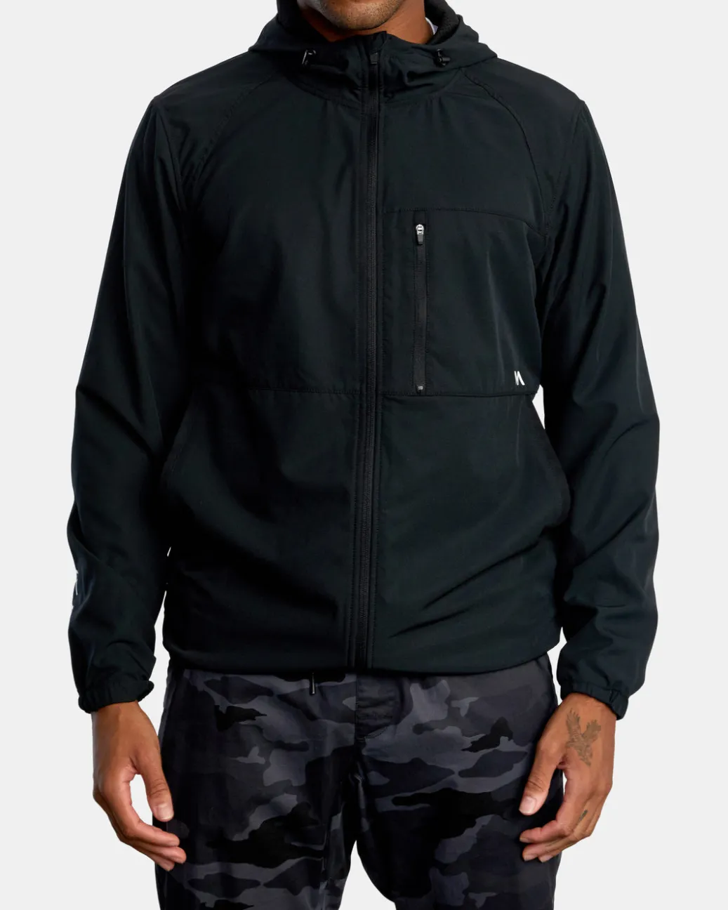 The RVCA Yogger Zip-Up Hooded Jacket II offers ultimate protection and style for days. Made from premium 4-Way Stretch, this men’s hooded jacket features a front zip closure, elastic hem and cuffs, adjustable toggles at the hood and pockets throughout for your needs. Topped with VA branding. Featured here in the Black colorway.