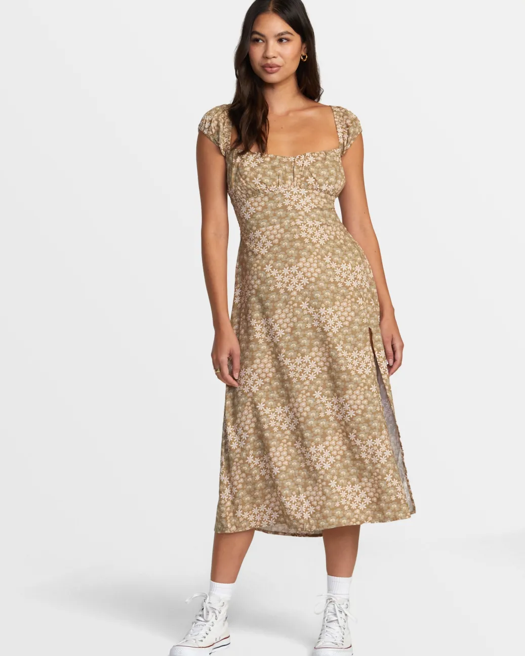 The Ava printed midi dress from RVCA features a playful silhouette in smooth viscose fabric. Cap sleeves and gathering detail at the bust add a touch of romance, and the dramatic side slit makes it flowy and fun.