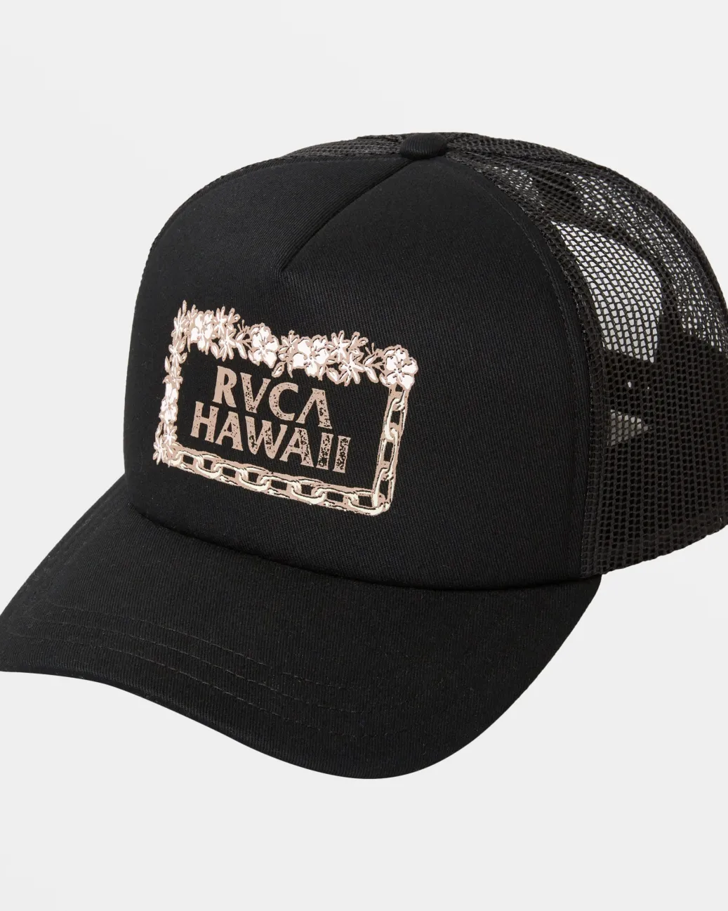 An island-inspired snapback cap for your next beach day. Crafted from lightweight and breathable polyester cotton with a mesh back, the curved bill keeps the sun out of your eyes whether hiking the tropics or daydreaming of palm trees. Featured here in the Rvca Black colorway.