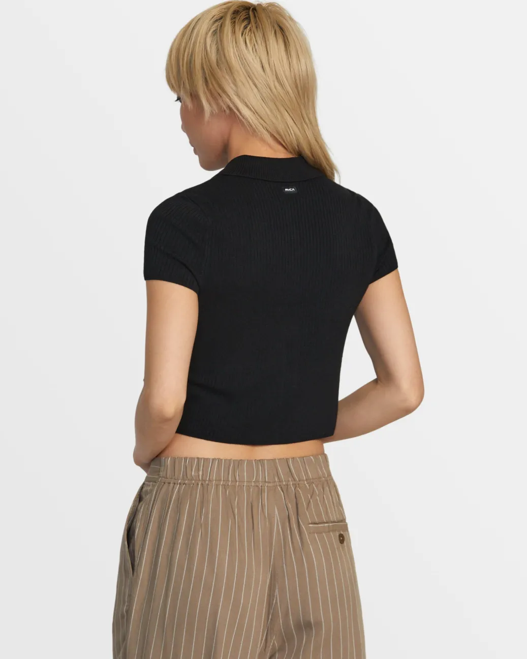 A cozy yet stylish polo sweater made from soft viscose-nylon yarns for all-day comfort and wearability. The collar neck and short sleeves give it a casual yet put-together look, while the button closure adds a touch of retro charm. Featured here in the Black colorway.