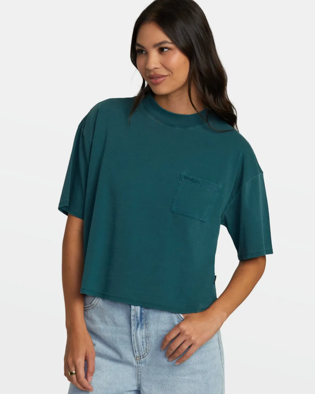 Cropped and boxy, the Kinney pocket tee adds modern touches with its ribbed mock neck and pigment-dyed cotton fabric to give it a well-worn look. Featured here in the Ponderosa Pine colorway.