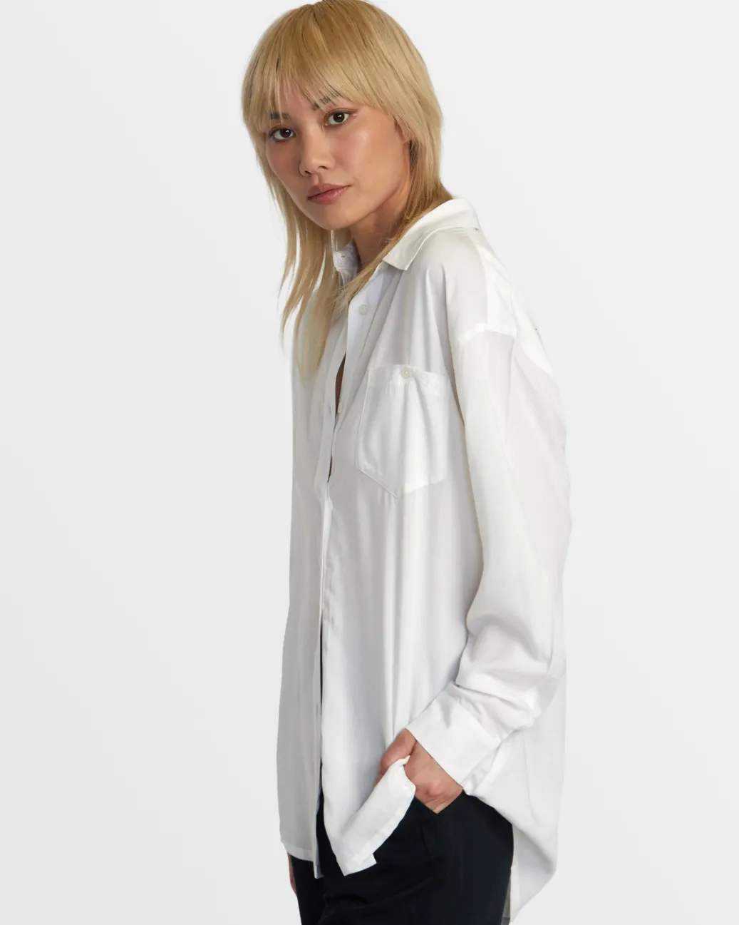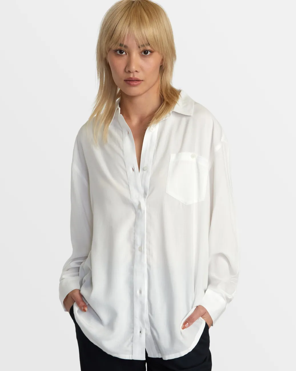A clean and understated long-sleeve button-up that’s perfect for everyday styling. The oversized silhouette is crafted of viscose fabric that’s soft and lightweight, perfect for a lightweight layer.